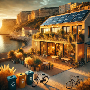 Illustration poétique d’une auberge écologique située à Marseille, en bord de mer, avec des panneaux solaires, des vélos, des composteurs et une atmosphère chaleureuse. Représente l’esprit durable et méditerranéen de La Girelle, entre soleil, nature et hospitalité engagée.